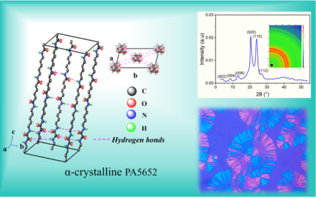 貴大新聞網(wǎng)訊(材料與冶金學(xué)院)近日,我校材料與冶金學(xué)院劉玉飛特聘教授團(tuán)隊(duì)在生物基聚酰胺材料研究領(lǐng)域取得重要突破,相關(guān)成果以 Biobased Polyamide 5652 with α?Crystal Form: Characterization and Low Moisture Absorption為題,發(fā)表于高分子領(lǐng)域頂級期刊Macromolecules(自然指數(shù)期刊,中科院一區(qū)TOP)。貴州大學(xué)材料與冶金學(xué)院為論文第一完成單位,材料與冶金學(xué)院2022級碩士研究生王艷平為第一作者,劉玉飛特聘教授為通訊作者。近年來,生物基聚酰胺56(PA56)因其原料可再生、低碳環(huán)保而備受關(guān)注,但其特殊的分子結(jié)構(gòu)(戊二胺單元含奇數(shù)碳原子)導(dǎo)致其晶體通常以γ晶型為主,飽和吸水率高達(dá)12%以上,在潮濕環(huán)境中力學(xué)性能顯著下降(如拉伸強(qiáng)度降低20%-30%),嚴(yán)重限制了在精密工程領(lǐng)域的應(yīng)用,而傳統(tǒng)改性方法往往以犧牲材料其他性能為代價。針對這一難題,劉玉飛特聘教授創(chuàng)新性地提出了雙氫鍵結(jié)構(gòu)調(diào)控策略:自主合成關(guān)鍵單體,設(shè)計并成功合成新型565二胺單體(C16H34N4O2),將565二胺與草酸二丁酯通過溶液聚合及